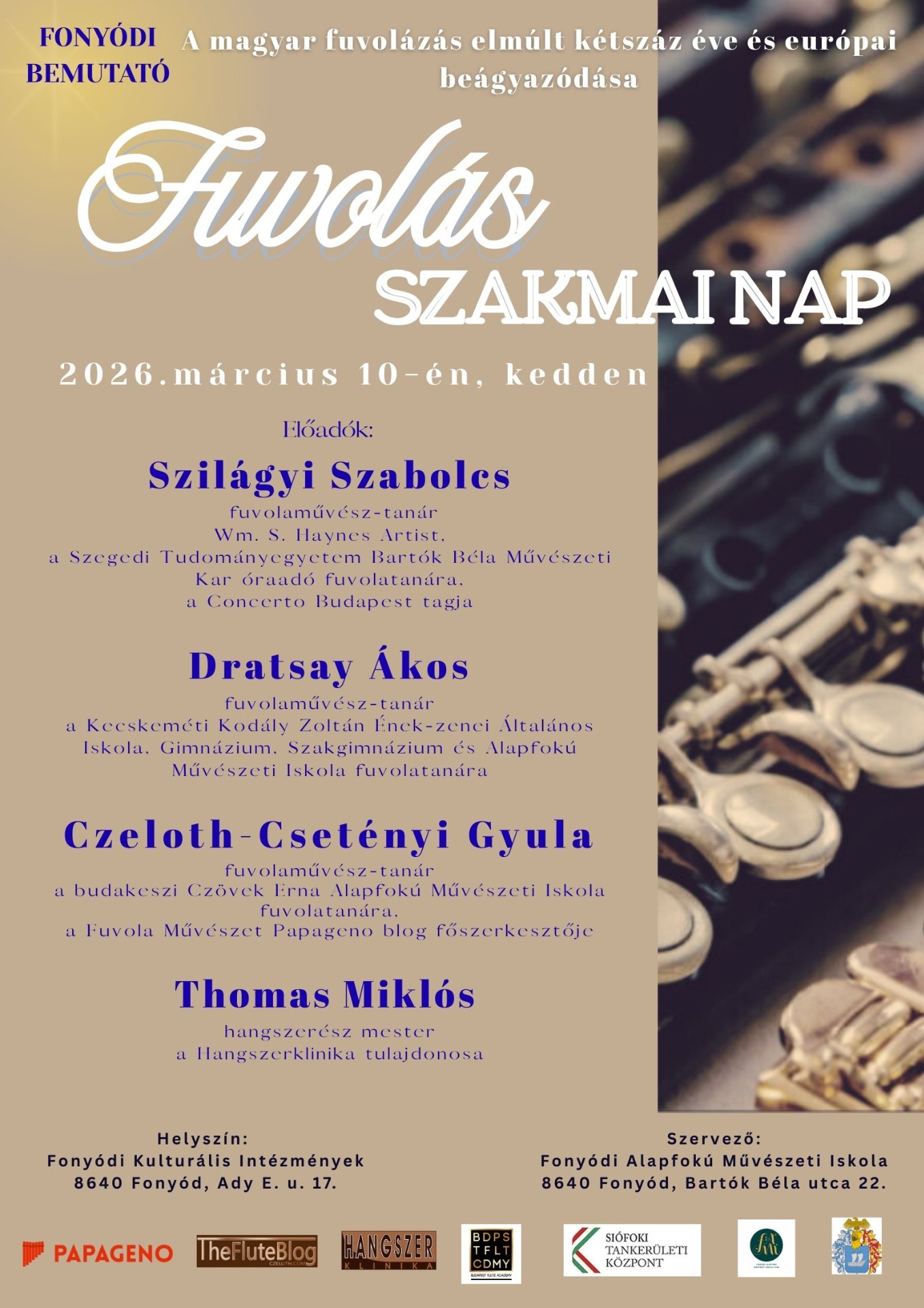 A Fonyódi Alapfokú Művészeti Iskola tisztelettel és szeretettel meghívja a fuvola szakos pedagógusokat és növendékeit FUVOLÁS SZAKMAI NAPRA, amely 2026. március 10-én (kedden) kerül megrendezésre Fonyódon, a Fonyódi Kulturális Intézmények épületében. (8640 Fonyód, Ady Endre utca 17.)
